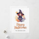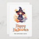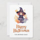 Bonne carte Halloween avec une aquarelle illustrant une petite sorcière dans un casquette. Personnalisez facilement cette jolie carte d'Halloween pour les enfants avec votre nom de famille et texte.