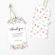 Étiquettes de remerciement de mariage printanières ou estivales rustiques et élégantes avec des fleurs sauvages colorées et une écriture calligraphique moderne.