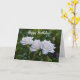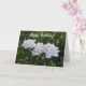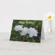 Mon oeuvre originale présentant ma photographie originale de trois fleurs de rose blanches dans un jardin, traitée avec un effet de fantaisie aquarelle pour une apparence illustrée et fantaisiste. Le recto de la carte indique "Joyeux Anniversaire!" et l'intérieur de la carte indique "En pensant à vous en ce jour spécial et vous souhaitant beaucoup de bonheur toujours!". Une excellente carte pour tout amateur de roses et de fleurs.