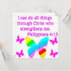 Montrez votre amour pour Jésus et les miracles se produisent avec ce joli papillon couleur arc-en-ciel Philippians 4:13 design. Je peux faire tout par le Christ qui me fortifie. Ce design Philippiens charmant et coloré 4:13 fera un don précieux quand bénit que quelqu'un spécial qui aime Jésus et la lecture de la bible. Ce joli feutre Philippians 4:13 scripture design aura l'air magnifique porter sur un Tee ou décorer votre maison avec l'un de nos produits de décoration maison exceptionnels. Partagez avec tout ce que Jésus-Christ est le Seigneur de votre coeur et le gardien de votre âme. Profitez de ce design de coeur plein d'amour qui est paisible, plein d'esprit, et serein. Quelle manière encourageante de partager l'amour de Jésus-Christ.