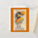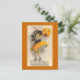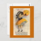 Belle carte vintage d'Halloween montrant une petite fille habillée en jaune et noir, surprise par un visage citrouille.
