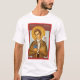 Cette conception de T-shirt de Christopher C. Smith dépeint Joseph Smith peint dans le style d'un saint catholique médiéval. Saisissant la bible et le livre de deux livres fondamentaux du Mormon-Mormonism d'écriture sainte-lui incline sa tête dans la contemplation. Une colombe se repose sur son épaule, symbolisant le Saint-Esprit, et des bordures d'un halo sa tête. Il utilise la veste en cuir brune rustique d'un prophète américain du 19ème siècle modeste.