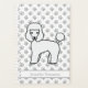 Illustration originale de Destei d'un mignon chien de race Toy Poodle couleur blanche vêtu. Il y a aussi une zone de texte personnalisable pour un nom ou un titre. L'arrière - plan a un motif gris clair d'empreintes de pattes de chien.