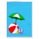 Carte d'art vierge avec parapluie vert, boule de plage rouge et blanc avec sandales et huile de bronzage contre un arrière - plan océanique estival aux vagues bleues et turquoises.