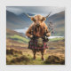 Vêtu d'un kilt et d'une veste dans les Highlands d'Écosse, une vache des Highlands tient un jeu de cornemuses. Si vous souhaitez cette image en noir et blanc, allez dans Personnaliser, trouvez les filtres sur le côté droit dans Designer, puis cliquez sur Filtre noir et blanc, Bonne conception.