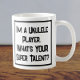 Drôle slogan sur une tasse de café qui dit "Je suis un joueur Ukulele. Quel est VOTRE super talent ?" Café Mug pour un joueur Ukulele ou quelqu'un qui joue l'Ukulele. Texte en gras noir et blanc.