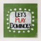 "Let's Play Dominoes" est un design de texte mignon avec une forme d'accent blanc entourée de points blancs texturés.