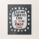 "Clean Sheets Day Is The Best Day" est un design de texte mignon en gris avec du texte noir et rouge. Les mots s'assoient sur une forme d'accent blanc entourée de mignons points blancs.