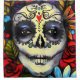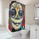 Jour floral vibrant de l'image morte sur un beau rideau en douche. Les fleurs modifiées la tonalité par bijou riche entourent le visage d'une femme peint pour le jour mexicain des morts. Prenez du temps de sentir les roses…
