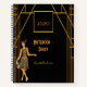 Carnet de style art déco en faux or et noir. Décoré avec une fille à flapper de style années 1920 et un cadre art déco. Modèles pour un an, texte et un nom. Un motif de style art déco à l'arrière.