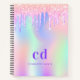Un arrière - plan holographique branché aux couleurs pastel rose, violet, vert menthe. Décoré avec des gouttes de rose et de violet. Personnalisez et ajoutez vos initiales et votre nom de monogramme. Lettres violettes. Un carnet pour prendre des notes, l'école, les devoirs, le journal, la journalisation.