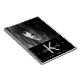 Un arrière - plan noir chic. Personnalisez et ajoutez votre propre photo, un nom, une lettre monogramme et une année. Le nom est écrit en blanc avec un grand script de style à la main moderne avec des swashes. La lettre monogramme en gris. Pour l'école, travaillez comme journal et journalisation. Pour que les swashes ne suppriment que le nom de l'échantillon, laissez les espaces ou les émoticônes devant et après le nom