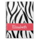 Cette couverture faite sur commande mignonne et élégante de carnet de notes à spirale de peau d'impression de zèbre et de zèbre avec les rayures noires et blanches et un contraste rose ont piqué la conception de ruban peuvent être personnalisés avec votre nom. Ce carnet à spirale peut être utilisé comme journal aussi, et il est également grand pour des approvisionnements de siège social ou de nouveau à l'utilisation d'école. Conception et © Chrissy H. Studios, LLC d'illustration. Tous droits réservés.