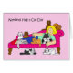 Une dame de bande dessinée allongée sur une chaise longue entourée de chats de différentes couleurs. L'image est d'un arrière - plan rose pâle et est accompagnée des mots "Journée nationale des câlins".