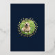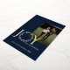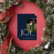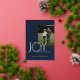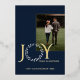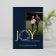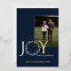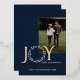 Élégante feuille d'or, "Joy, Peace, Happiness", lettre de voeux en bleu et or. Le mot Joy a une couronne pour la lettre O et cette jolie feuille continue à l'arrière de la carte comme cadre pour une photo supplémentaire.