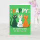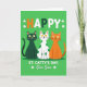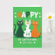 Cette carte montre un fond vert émeraude avec trois chats stylisés assis côte à côte comme de bons amis posant pour une photo 💚. À gauche se trouve un chat vert forêt foncé avec une queue à pointe sombre, au milieu un chat blanc recouvert de pois verts vifs, et à droite un chat orange ensoleillé avec une queue rayée plus foncée. Ils regardent vers l'avant avec de grands yeux jaunes, de minuscules nez roses et de fines moustaches noires, leurs petits sourires donnant à la scène une atmosphère douce et affectueuse. Près du haut, « HAPPY » apparaît en lettres découpées en orange, blanc et vert plus foncé, espacées dans la partie supérieure. De petits trèfles blancs flottent autour des chats comme des confettis ☘️. Sous le trio, la ligne « ST. CATTY'S DAY, Our Son » est inscrite en lettres blanches et centrée sous eux. Les formes simples des chats et
