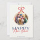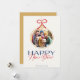 Ces cartes de voeux fantaisistes de 5" x 7" sont dotées d'un ornement photo arboré avec un arc rouge. Le message d'accueil est "Bonne année", en rouge, bleu marine et or avec des espaces réservés pour votre photo préférée, nom(s) de famille et année.