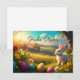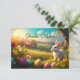 Dans une vallée idyllique baignée de soleil s'étend un paysage printanier pittoresque avec des collines douces et des arbres en fleurs. Un lapin de Pâques d'un blanc éclatant est assis avec attention dans l'herbe, entouré d'œufs de Pâques colorés et artistiquement décorés. Les fleurs aux couleurs vives et la lumière chaude et dorée du soleil couchant confèrent à la scène une atmosphère paisible et festive. Au-dessus de la scène flotte l'inscription élégante « Joyeuses Pâques », qui souligne l'ambiance festive.