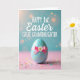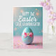 Cette carte montre un grand œuf bleu pastel posé dans le tiers inférieur, sa surface lisse parsemée de petits points de confettis multicolores qui ajoutent une atmosphère de fête légère 🌷. Un ruban rose vif entoure le milieu et se noue en un joli nœud, surmonté d'une unique fleur ressemblant à une marguerite avec un centre jaune ensoleillé, comme un petit cadeau offert avec affection. Le fond passe d'un bleu-vert calme en haut à une zone rose pastel près du bas, créant un cadre printanier doux où un lien étroit peut être imaginé. Des cercles de lumière chaude et floue brillent dans la partie supérieure, comme des guirlandes de fées lointaines veillant sur la scène. De petits morceaux de confettis sont dispersés sur le premier plan rose, faisant écho aux points sur l'œuf et poursuivant la célébration 🐰. Dans la partie supérieure, des lettres blanches fluides lisent « Joyeuses 1ères Pâques Arrière-petite-fille », centrées et faciles à repérer sur les tons plus frais.