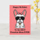 Frenchies, montrez à votre maman un peu d'amour pour son anniversaire avec une carte personnalisée juste de vous. Le message sur le recto de la carte dit "Joyeux anniversaire à la Meilleure Maman Française !" Le message intérieur dit : "Je t'aime plus que des gâteries, Joyeux Anniversaire." Le dessin présente une jolie illustration de dessin animé d'un bulldog français de couleur blanche portant un arc et un collier roses. Police et couleur arrière - plan et être modifié en sélectionnant "Cliquez pour customiser plus loin".