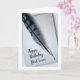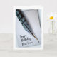 Une seule plume de jay bleu sur papier de note avec le script "Happy Birthday Bird Lover" décore cette joyeuse carte de voeux d'anniversaire. Customisez le capot et à l'intérieur comme vous voulez avant la commande. Copyright © Shoaff Ballanger Studios.