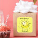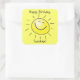 Un autocollant carré qui correspond à notre invitation "Joyeux Anniversaire soleil" avec une image d'un soleil jaune souriant et le sentiment optionnel "Joyeux Anniversaire, soleil !" sur jaune. Voir collant vinyle taillé sur mesure, carte, enveloppe, sac de faveur, ballotin, étiquette de faveur et étiquette. Voir l'ensemble de la collection Sticker d'anniversaire dans les INVITATIONS | Section Stickers & Étiquettes.