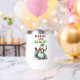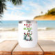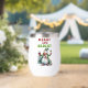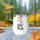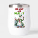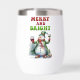 Un design de Noël amusant et gai présente un bonhomme de neige joyeux habillé d'un long manteau vert avec un chapeau dessus assorti, un foulard rouge et des mitaines. Il tient un verre de vin rouge d'une main et du vin blanc de l'autre. Le texte rouge et vert festif dit : "Joyeux et lumineux." Ce design est disponible sur une variété de produits, ce qui en fait un cadeau parfait pour les amateurs de vin.