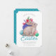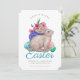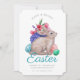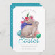 Notre classique et joyeuse Happy Bunny & Flowers de Pâques personnalisable Carte de vacances à plat présente une aquarelle peinte à la main illustrant un adorable lapin de Pâques avec la collection peinte pastel OEufs de Pâques contre un arrière - plan de fleurs printanières vives, y compris tulipes roses, hydrangées bleues et lavande. Le texte de salutation principal indique "Ayez une Pâques heureuse", tout le texte peut être mis à jour pour créer une carte de voeux de Pâques personnalisée pour envoyer des voeux chaleureux ce printemps!