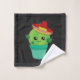 Serviette munie d'un motif extensible. Une jolie illustration d'un cactus rond, avec de grands yeux kawaii, souriant et portant un sombrero rouge. À l'intérieur d'un pot de fleurs. L'arrière - plan est noir, rendant les couleurs pop.
