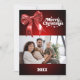 Un arrière - plan de dégradé rouge, un texte blanc, un arc rouge. Texte et photo sur le devant. Votre texte et vos noms à l'arrière. Joyeux Noël est écrit avec une police de style rétro.