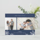 Elégant et moderne Hanoukka carte photo propose deux photos préférées alignées côte à côte, avec "Joyous Hanoukka" en haut en italique blanc et en typographie de bloc. Personnalisez avec votre salutation personnalisée et votre nom en bas, accentué par quatre illustrations de flocon blanc. Un arrière - plan bleu marine ajoute une élégance classique à votre accueil de vacances. La carte revient à un motif de chute de neige en gris chic.