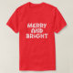 Un joyeux T-shirt sur le thème de Noël avec écriture contemporaine en minuscules qui dit "Joyeux et lumineux." La couleur du texte (blanc) et le style du T-shirt rouge.