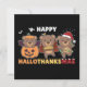 Joyeux Hallothanksmas - joyeux Halloween, Thanksgiving et Noël. L'ours est habillé en chauve-souris pour Halloween. Avec une tarte pour Thanksgiving. décoré du chapeau du Père Noël à Noël.