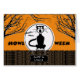 Heureux Howloween pour une tante et oncle, Scaredy Cat carte de voeux papier. Présente une illustration vintage d'un chat sur une clôture hurlant à la pleine lune et des chauves-souris derrière elle. Carte de voeux Halloween avec arbres morts, lune, chat, chauves-souris et clôture. Copyright © Shoaff Ballanger Studios.