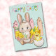 C'est une jolie carte de voeux de Pâques qui présente un adorable lapin lapin de bébé tenant une fleur de jonquille. Le lapin est assis devant une clôture de piquetage et un groupe de jonquilles. À côté de lui, il y a une petite poussette jaune fraîchement éclos. Le texte stylisé et coloré en haut dit "Bonne Pâques". L'intérieur de la carte contient deux champs de texte supplémentaires que vous pouvez customiser.