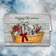 L'avant de cette carte de voeux de vacances amusante a une image délicieuse de deux adorables chiots dalmates dans un panier en osier. La corbeille est décorée de bouquets de fleurs poinsettia et d'un arc rouge vif. Le texte personnalisable au-dessus de l'image dit "Joyeux Noël" en écriture verte. Tout est placé sur un arrière - plan rustique en bois gris. L'intérieur contient deux champs de texte supplémentaires que vous pouvez customiser comme bon vous semble.