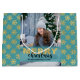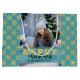 Une carte de Noël moderne et élégante avec une bordure bleu glace et un script de typographie noir or superposé sur le devant; Le dos de la carte a parties scintillant or dessiné main motif de flocon de neige sur un arrière - plan bleu menthe turquoise. Il est facile de changer l'échantillon de photo verticale avec votre propre photo.