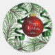 Joyeuses fêtes Ornement de Noël rouge avec ruban vert sur l'arrière - plan des branches de pin autocollants ronds. Ornement et ruban courtoisie de Obsidian Dawn.