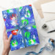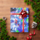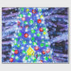 Joyeux Noël stylisée typographie bleue, avec un arbre de Noël vibrant avec des ornements verts, rouges et jaunes et un ciel coloré et enneigé arrière - plan répétition design motif pour votre joie festive.