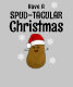 Adorable pomme de terre de dessin animé marrante, mignonne et heureuse, portant un chapeau de Père Noël rouge et blanc. La pomme de terre est dans un style d'art de dessin animé et colorée en marron, elle a des bras et des doigts en bâtonnets et un grand sourire heureux avec des points pour les yeux. Le chapeau de Père Noël sur sa tête est rouge avec une bordure blanche et un pompon blanc qui pend. Elle est à l'intérieur d'une forme ovale bleu clair avec un cadre bleu foncé et deux feuilles de houx vertes avec deux baies rouges en haut de l'ovale. Les mots "Passez un Noël Spud-taculaire" sont en texte noir au-dessus de l'image.