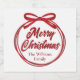 Scénario moderne et chic à travers un magnifique ruban rouge et arc lit MERRY CHRISTMAS en élégante typographie cursive. Un noeud ligoté est super tendance pour les étiquettes de bouteille de champagne de fête 2025. Personnalisez avec votre nom de famille ou d'entreprise dans le centre.