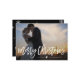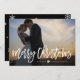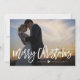 Carte de vacances moderne avec les mots "joyeux noël" dans un script blanc écrit à la main avec votre photo affichée derrière. La superposition blanche, le coeur et le texte peuvent être positionnés n'importe où sur la carte. Le dos de la carte est muni d'un motif à flocon blanc.