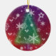 Une dispersion de flocons de neige blancs, de feuilles saints et de baies, d'étoiles et de pins contre un arrière - plan brillant de rouge, d'orange, d'or et de violet, avec au milieu un doux arbre de Noël vert.