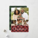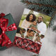 Festive holiday carte photo présente quatre de vos images préférées disposées dans une mise en page collage. "Joyeux Noël" apparaît en dessous en lettres blanches sur un arrière - plan de buffle peint à la main et rustique en rouge et noir. Personnalisez avec vos noms et l'année.