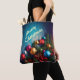 Sac fourre-tout de Noël de taille moyenne avec personnalisation du texte. Décorations colorées sur un arrière - plan bleu foncé. Personnalisez ce sac avec votre propre texte.