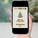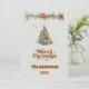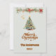 Un arrière - plan vert sage, texte doré et photo sur le devant. Décoré d'un sapin de Noël et d'une guirlande de pins aux fleurs de poinsettia rouge. Votre texte et vos noms à l'arrière. Joyeux Noël est écrit avec une police de style rétro.
