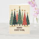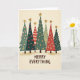 Cette carte de vœux festive et folklorique présente un groupe charmant de sept sapins de Noël stylisés. Chaque arbre arbore un motif unique, notamment des pois, des rayures, des flocons de neige et des motifs en zigzag, rendus dans une palette de couleurs chaudes de verts profonds, de rouges, de roses et d'accents dorés. Chaque arbre est surmonté d'une étoile dorée pointue, ajoutant une touche de fantaisie rustique. La scène festive est placée sur un fond crémeux et neutre, et la carte porte le message inclusif "Joyeux tout" en lettres majuscules grasses et amicales. Répandez la joie pendant cette période des fêtes avec cette carte parfaite pour diffuser la bonne humeur des fêtes !