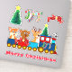 Cet autocollant fantaisiste présente trois animaux adorables, un chat, un ours et un renne, à bord d'un train de Noël. Le train est décoré de bas de Noël et d'un arbre.
