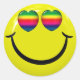 des autocollants brillants, joyeux en jaune original, traditionnel avec des coeurs arc-en-ciel pour les yeux! Mettez-vous sur un visage heureux avec ces autocollants lumineux et amusants et joyeux! Donnez-les à vos amis et rappelez-leur de mettre un visage heureux ! Célébrez et montrez l'égalité et l'amour pour tous !