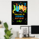 Bienvenue à vos invités avec énergie et excitation en utilisant cette vibrante Affiche de bienvenue Jump Birthday Party! Avec des couleurs audacieuses, des silhouettes ludiques, des accents de parties scintillant et un design dynamique, ce panneau donne le ton d'une fête amusante.